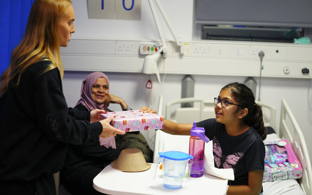 女子チームのマチルダ・ヴィンベリ、リゼ・コップ、アマンダ・ニルデンに加え、マーティン・ホー監督が参加。地元のアーチウェイにあるこの病院で、子供たちに直接ギフトを手渡した。