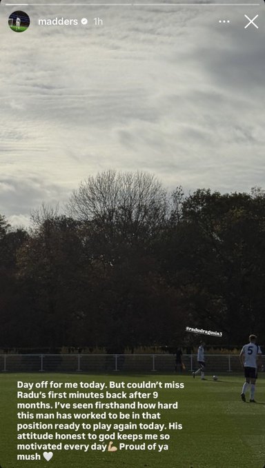 ラドゥ・ドラグシンが9ヶ月ぶりに実戦復帰を果たし、トッテナムのチームメイトであるジェームズ・マディソンが心温まるメッセージを送り、2人の間に感動的なやり取りが交わされた。